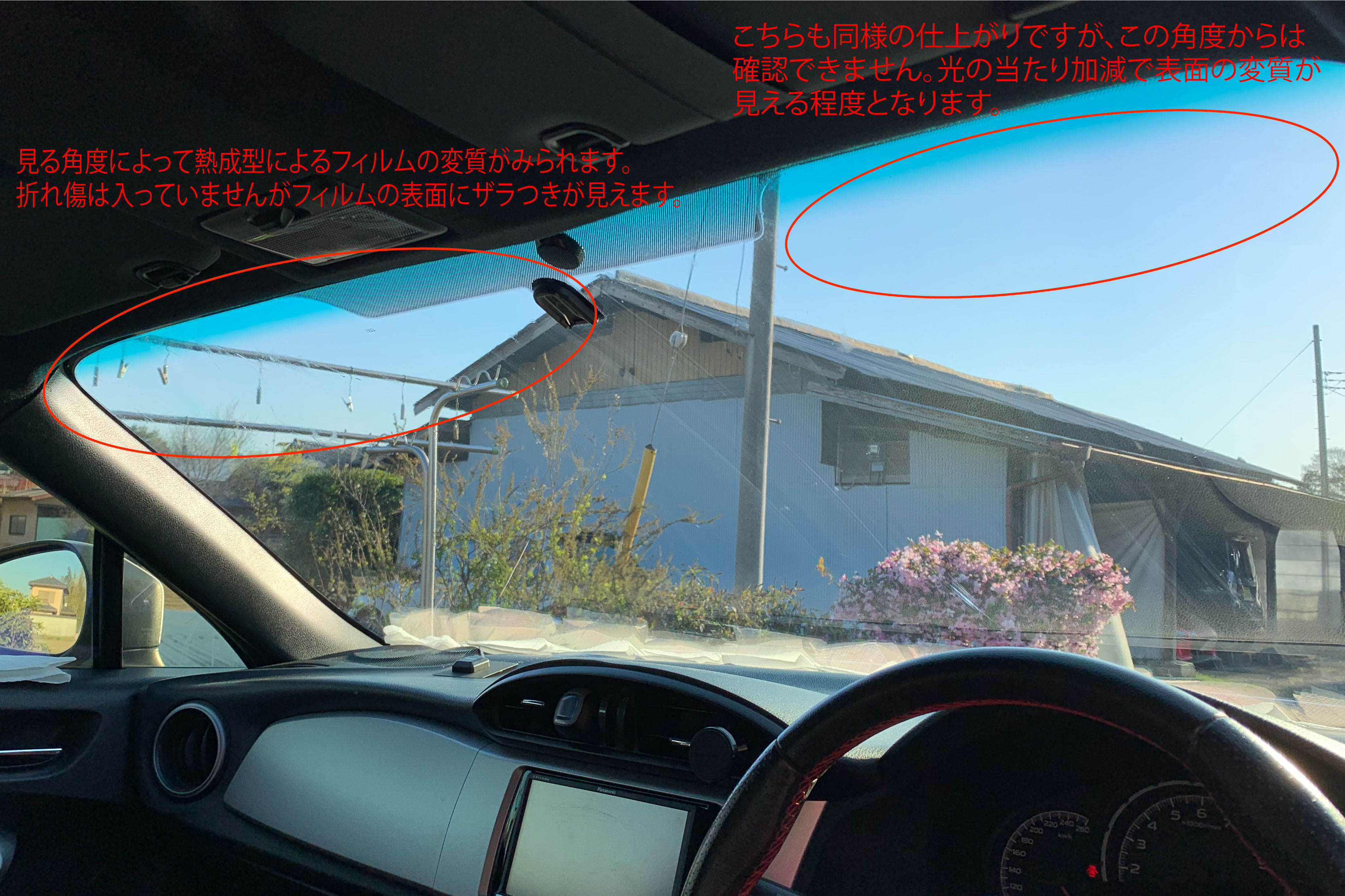 また、フロントなどガラスが大きく湾曲のキツイ部位へ施工する場合、フィルムが厚いため熱成型が十分にできない車種がございます。