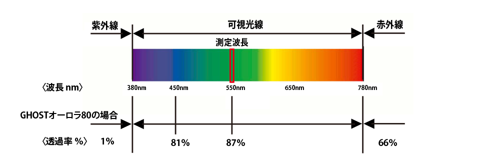 当店にて使用している透過率測定器は光の波長550nm(緑色の可視光線)の透過率を測定しております。機種により測定波長が異なる場合、表示される透過率にも誤差が生じますのでご注意ください。カーフィルムは赤外線(長波長)と紫外線(短波長)の透過を防ぐ役割があり、また視認性を高めるため可視光線の領域の波長を透過するように開発されております。そのため、透過率測定器に関しては、可視光線領域の中央値である550nm(緑色)から測定波長が遠ざかるほど透過率は低く表示されてしまいます。(実際はバラつきあり)